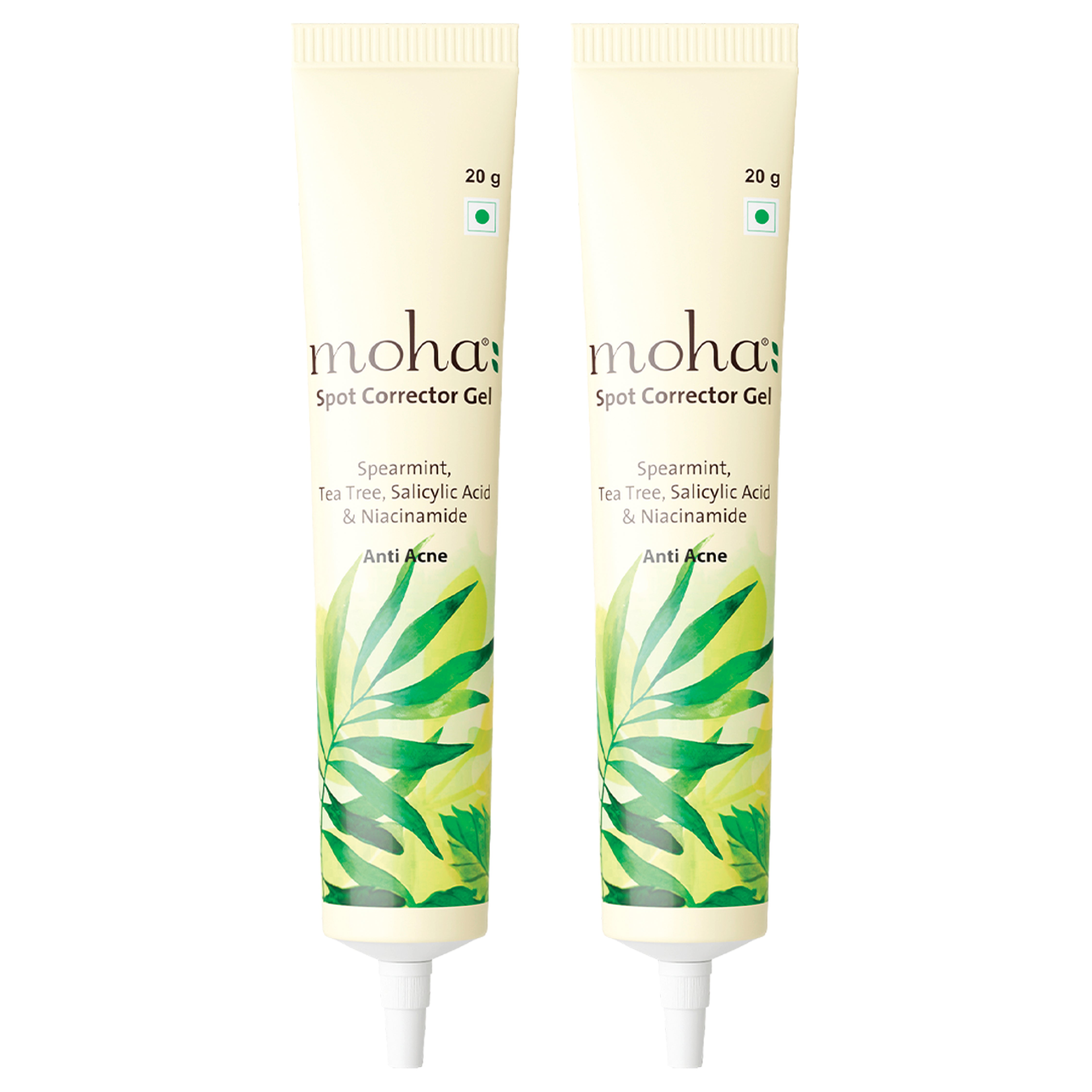 Quick treatment from active acne, kind and gentle Ayurvedic care for your skin. Say goodbye to angry pimples with moha Spot Corrector Gel - your Ayurvedic acne saviour. Powered by Shalmali, Spearmint, and Tea Tree oil, it clears active acne, calms redness, and soothes inflammation without drying your skin. Gentle yet fast-acting, it works from the first application. Safe for all skin types, everyday.
