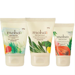 Your Spa at Home Kit contains: moha: Foot Care Cream moha: Nail Care Cream & moha: Aloe Vera Gel.