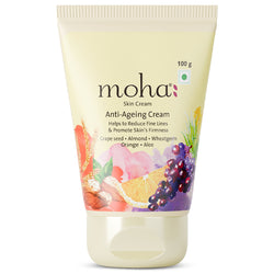 moha: Anti-Ageing Cream is your daily defense against fine lines, wrinkles, and sagging skin. This luxurious yet lightweight formula blends Grapeseed, Almond, and Wheatgerm Oils to nourish deeply and support skin renewal. Enriched with Vitamin C, Lemon Oils and Healing Aloe, it improves elasticity, reduces age spots, and restores a youthful, radiant tone - without greasiness or heaviness.